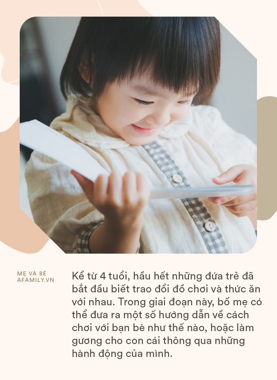 Kể từ 4 tuổi, hầu hết những đứa trẻ đã bắt đầu biết trao đổi đồ chơi và thức ăn với nhau. Chúng cũng bắt đầu biết thích chơi với những bạn có cùng sở thích với mình. Đặc biệt, khi đi học mẫu giáo, trẻ có cơ hội tiếp xúc với nhiều bạn bè hơn, bản thân trẻ sẽ trải qua những mối quan hệ giữa các cá nhân.